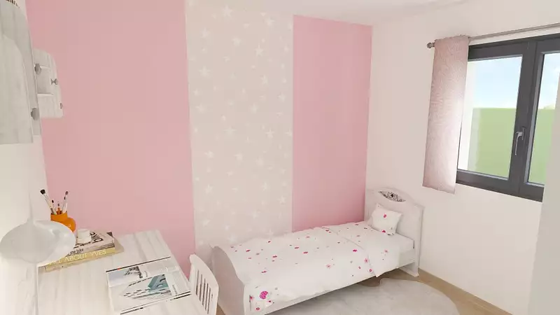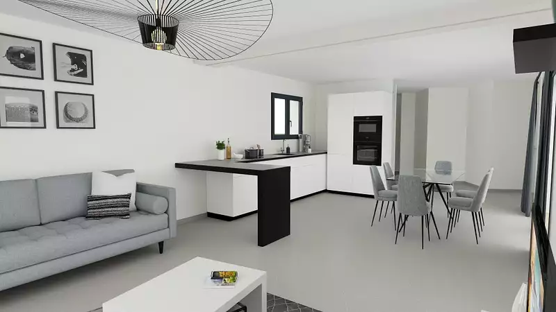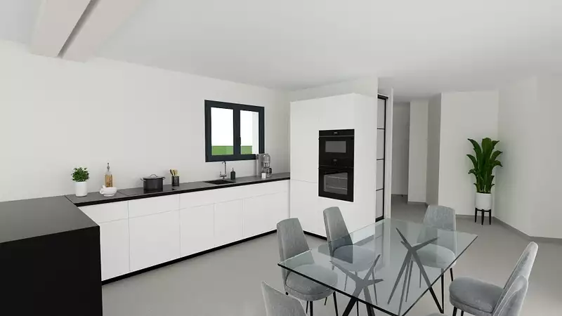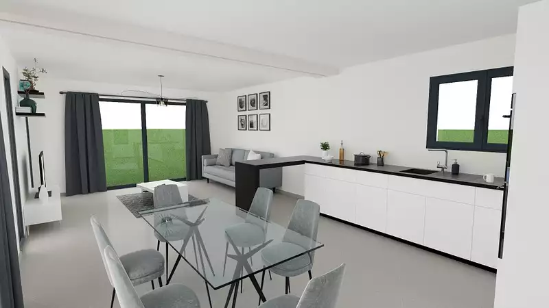 Cette maison vous offrira un agréable espace de vie lumineux par ses nombreuses ouvertures donnant sur votre futur jardin.