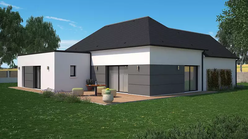 Un plan en L qui change tout !. Cette maison séduit au premier regard par son architecture en L, qui structure l’espace avec fluidité et caractère. L’espace de vie s’ouvre naturellement sur l’extérieur, baigné de lumière et prêt à accueillir vos moments de partage. Le coin nuit, bien séparé, propose 4 chambres confortables et deux salles d’eau pour une vie de famille tout en douceur. Le cellier attenant à la cuisine et le garage intégré ajoutent une touche de praticité au quotidien. Un modèle pensé pour s’adapter à toutes les envies, avec un vrai potentiel de personnalisation. . Pour un confort optimal et conforme à la RE2025, cette maison dispose d’une PAC avec plancher chauffant et volets roulants électriques. À noter : Le prix indiqué exclut les revêtements de sol des chambres, la cuisine aménagée, la peinture, la décoration, les raccordements, les frais de notaire et l’assurance dommages-ouvrage. .