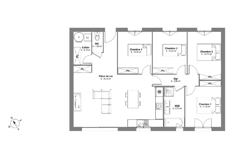 Conçue de plain-pied, elle propose quatre chambres, une cuisine, un cellier et une salle de bains.