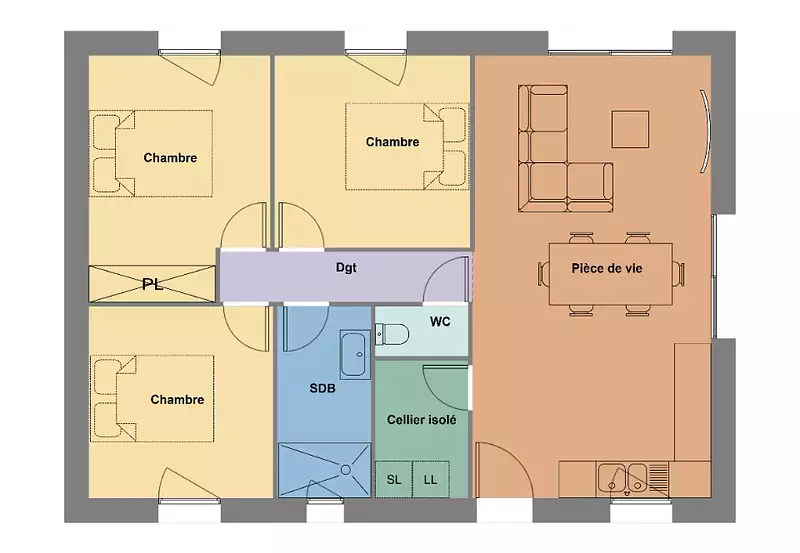 Maison de 69 m² comprenant 3 chambres, une cuisine ouverte et une salle de bains.