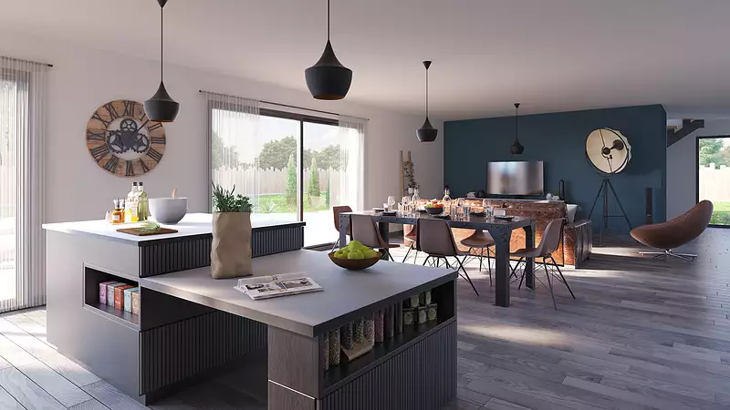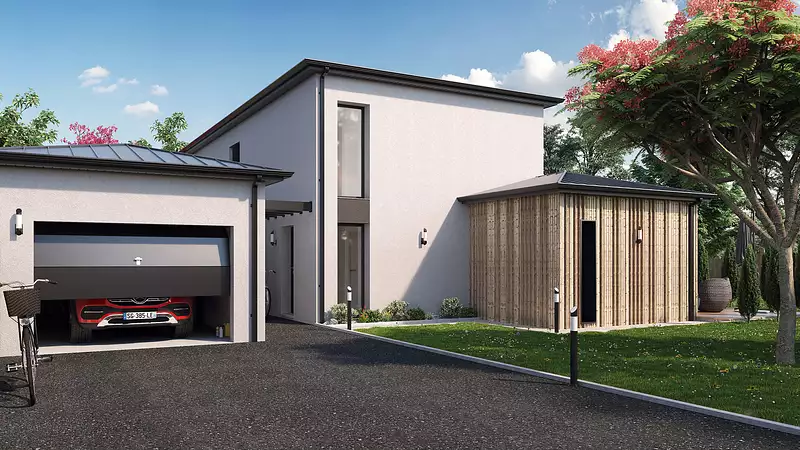 Découvrez cette maison contemporaine aux lignes élégantes, pensée pour allier confort et praticité. Ses volumes généreux et sa luminosité naturelle offrent un cadre de vie idéal pour toute la famille. Avec 5 chambres, dont une suite parentale au rez-de-chaussée, elle s’adapte parfaitement aux besoins de chacun. Son grand espace de vie ouvert favorise la convivialité, tandis que l’étage propose des chambres spacieuses et une salle de bain dédiée. Afin de vous garantir un confort optimal et de répondre aux exigences de la RE2025, cette maison est équipée d’un système de chauffage par pompe à chaleur (PAC), avec un plancher chauffant au rez-de-chaussée et des radiateurs à l’étage. Des volets roulants électriques complètent les prestations pour plus de praticité. À noter :Le prix indiqué ne comprend pas la fourniture et la pose des revêtements de sol dans les chambres, la cuisine aménagée, ainsi que la peinture et la décoration intérieure. Il exclut également les raccordements, les frais de notaire et l’assurance dommages-ouvrage. (Piscine non contractuelle, non comprise dans le prix).
