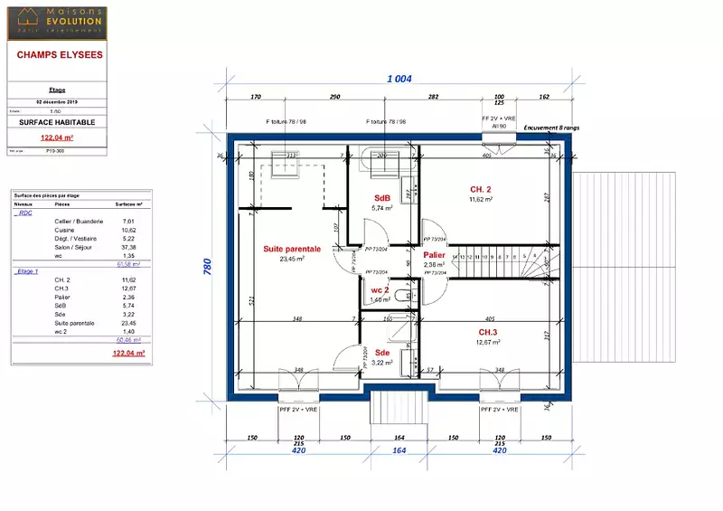 Elle est composée de 3 grandes chambres dont une grande suite parentale avec salle d'eau, d'une seconde salle de bains, de deux WC séparés et d'un grand salon-séjour lumineux avec cuisine ouverte donnant sur un vaste cellier/buanderie. Il est possible d'y ajouter un garage ou un carport.