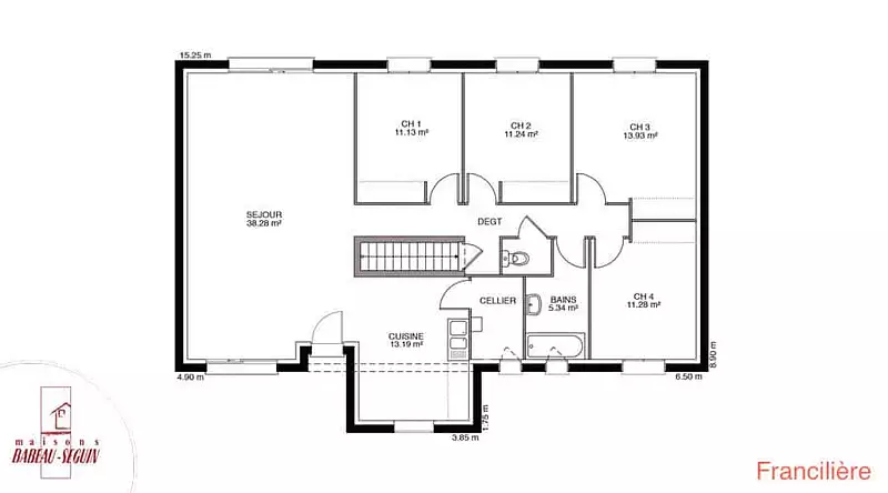La Francilière se distingue par son design peu commun dans la maison individuelle et offre un aménagement intérieur répondant parfaitement aux critères des familles les plus exigeantes. Elle dispose de 4 chambres et de 4 pièces, dont une grande pièce de vie de plus de 38 m², parfaite pour vos moments en famille ou entre amis.