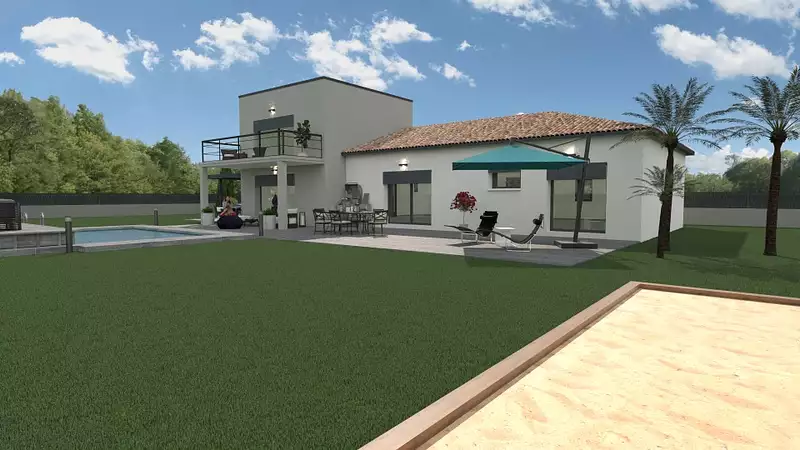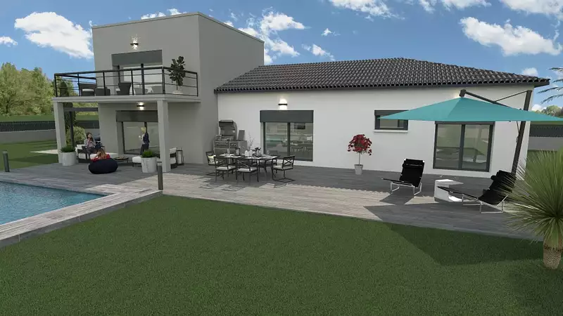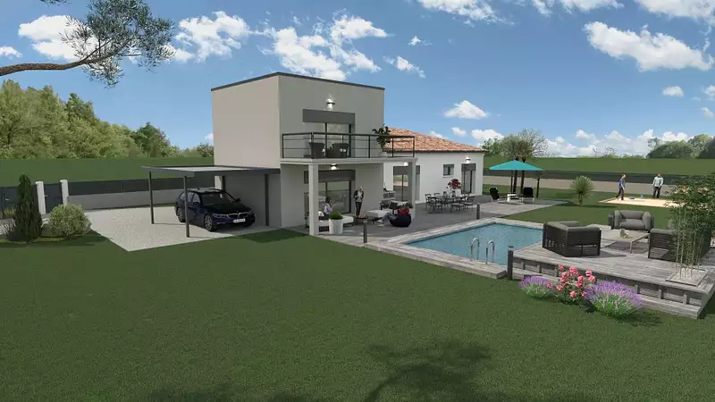 Maison contemporaine sur 2 niveaux. Possibilités de jouer avec les toitures, 4 pans ou toit terrasse végétalisée pour l'étage. Au rez-de-chaussée, vous trouverez, 3 chambres avec une salle de bains, une suite parentale complète avec dressing et salle d'eau privative. 2 WC séparés, une cuisine ouverte sur la pièce de vie de 50 m². La partie étage se compose d'une 2ème suite parentale de 25 m² avec salle d'eau et dressing, vous offrant une vue dégagée avec un balcon de 10 m². Une terrasse couverte de 12 m² en RDC et un beau porche d'entrée s'ajoutent ! Possibilité d'y accolé un garage.