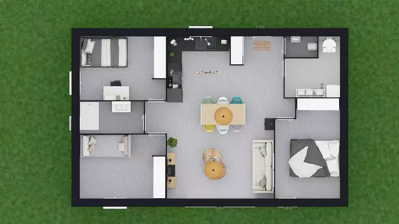 Conception traditionnelle pour ce projet de maison à toit à 2 pans. L'intérieur offre 77 m2 de surface habitable et se compose de 3 chambres, d'une salle d'eau et d'un bel espace de vie avec cuisine ouverte de 35 m² avec cellier le tout de plain-pied. Système de chauffage par pompe à chaleur air/air.