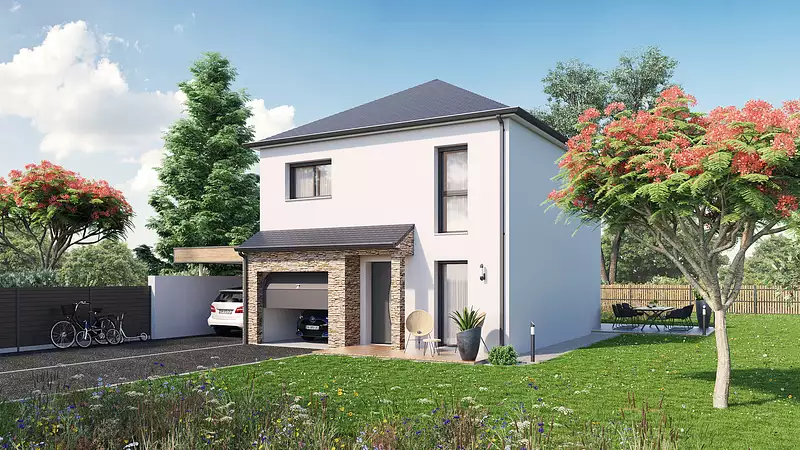 Une façade optimisée, une maison qui s’intègre partout ! Avec sa façade pensée pour les terrains étroits, cette maison allie design compact et espaces généreux. Son architecture moderne maximise la lumière et l’ouverture, tout en offrant un intérieur spacieux et fonctionnel. Profitez d’un séjour convivial et lumineux, de 3 belles chambres, d’une salle de bain spacieuse, et d’un garage astucieusement intégré. Chaque détail est optimisé pour un confort absolu. Pour un confort optimal et conforme à la RE2025, cette maison dispose d’une PAC avec plancher chauffant, radiateurs à l’étage et volets roulants électriques. À noter : Le prix indiqué exclut les revêtements de sol des chambres, la cuisine aménagée, la peinture, la décoration, les raccordements, les frais de notaire et l’assurance dommages-ouvrage. Une maison élégante et adaptable – idéale pour donner vie à vos envies !.