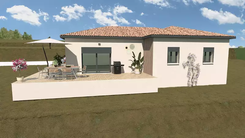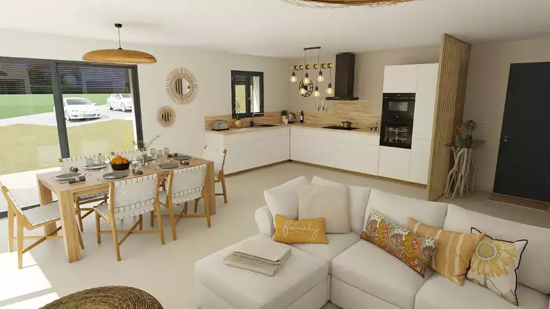 Maison de plain-pied avec un décroché en façade, elle comporte 3 chambres, une salle d'eau, 1 WC, 1 grand cellier et une belle pièce de vie de 46 m² avec cuisine ouverte vous permettant de recevoir vos amis et votre famille.
