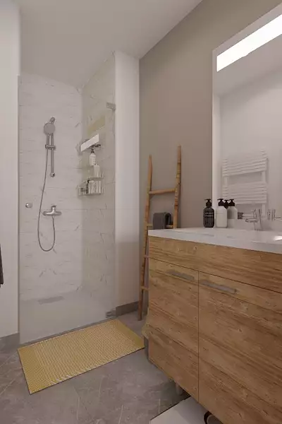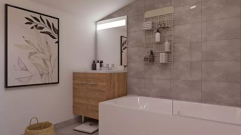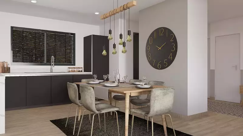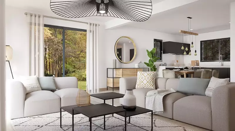 Belle maison à étage optimisée pour les terrains de toutes les tailles, la Natirey est une maison au design travaillé. Le mélange d'enduit et de bardage qui recouvre la façade avant de la maison lui donne un charme particulier. Si cette maison est conçue pour convenir à tous types de terrains, même les plus exigus, elle propose de très beaux espaces à l'intérieur. Une pièce de vie de 48m² et une suite parentale de près de 20m² compose l'essentiel du rez-de-chaussée. Ces beaux volumes donne une impression d'espace très agréable et permet à toute la famille de se retrouver en étant à l'aise dans le salon. A l'étage, 3 grandes chambres de près de 12m² composent l'espace « nuit », une salle de bain attenante à l'une des chambre permet aux enfants et aux parents d'avoir chacun leur salle de bains.