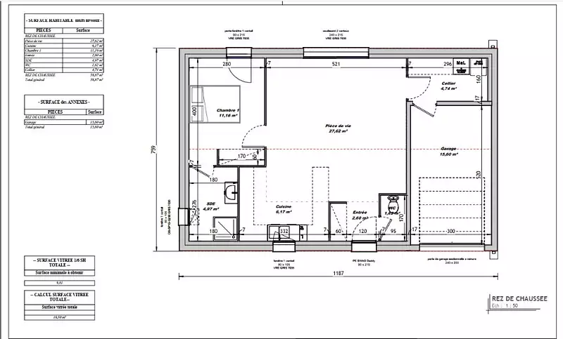 Elle se compose d'une entrée avec placard, d'une pièce de vie lumineuse ouverte sur le jardin par une large baie vitrée, 1 chambre, d'une salle d'eau, de WC séparés ainsi que d'un cellier. Un garage accolé de 18 m² complète ce projet.