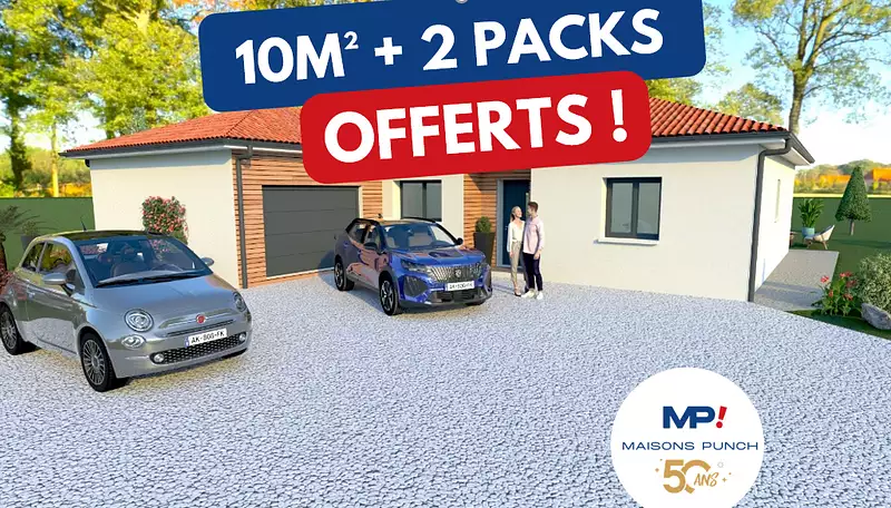 Terrain proposé et vendu par notre partenaire foncier selon disponibilités, le constructeur n’étant pas mandaté pour réaliser la vente du terrain. Prix terrain inclus : 100 000 € Frais de notaire non inclus : € Prix maison inclus : 195 000 € VRD non inclus : € Hors aménagements extérieurs (extensions, terrasse, piscine etc), papiers peints, peintures, moquettes dans les chambres (tarif en vigueur au 20 mai 2025, modifiable sans préavis, prix variables suivant les prestations souhaitées). Hors frais d’hypothèque. Différents modèles disponibles pour chaque terrain. Assurance RC professionnelle/décennale/dommage ouvrage groupe Aviva. Garantie de remboursement de l'acompte/livraison à prix et délai convenu CGI. Partenaire financier : à préciser Le numéro de TVA intracommunautaire : FR 14 498 627 272 00012 Contact : contact@maisons-punch.fr