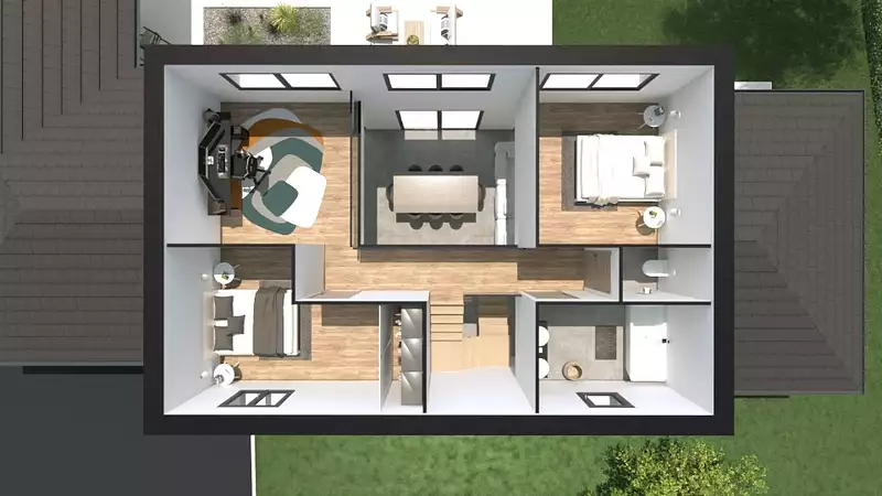 Des prestations premium : baies vitrées coulissantes en aluminium, escaliers personnalisables, carrelage contemporain, sanitaires de qualité,