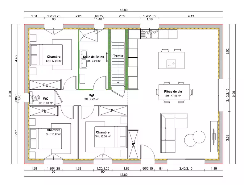 Surface habitable : 90 m²