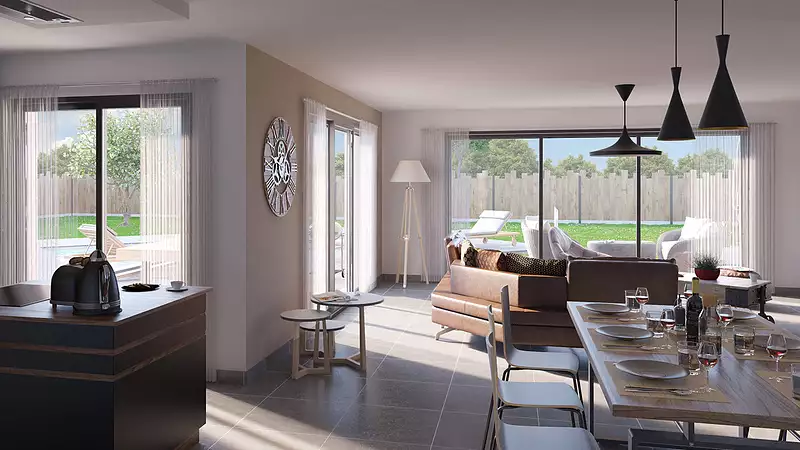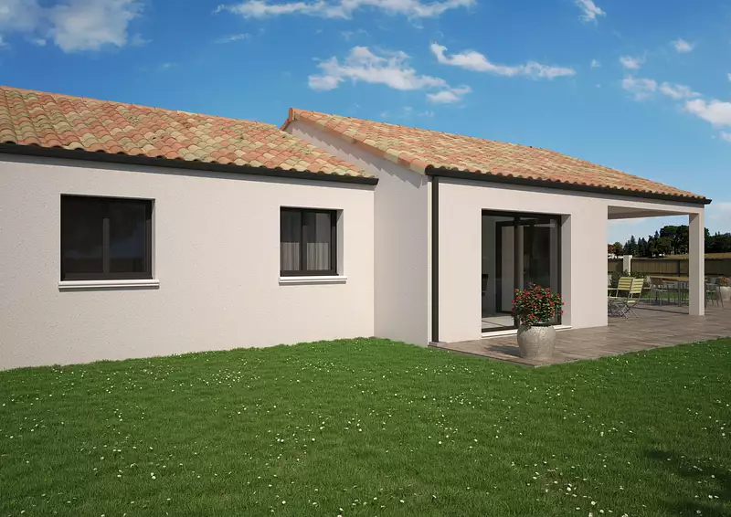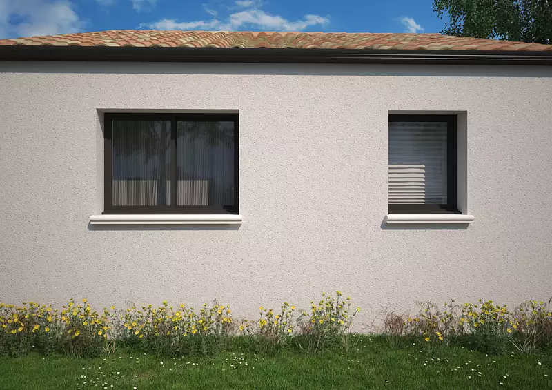 Un plan qui sort du cadre, une ambiance lumineuse et un vrai caractère : cette maison de plain-pied en angle a tout pour plaire. L’espace de vie central, baigné de lumière naturelle, crée une vraie dynamique entre cuisine, salon et extérieur. Les 3 chambres sont bien séparées, pour offrir calme et intimité, tandis que la salle d’eau moderne, le cellier pratique et le garage intégré complètent un ensemble parfaitement pensé. Un modèle modulable et stylé, qui s’adapte à toutes les envies de vie : premier achat malin ou refuge secondaire de charme. Pour un confort optimal et conforme à la RE2025, cette maison dispose d’une PAC avec plancher chauffant et volets roulants électriques. À noter : Le prix indiqué exclut les revêtements de sol des chambres, la cuisine aménagée, la peinture, la décoration, les frais de notaire et l’assurance dommages ouvrage.