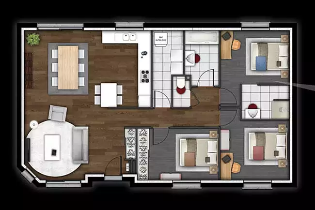 Elle se divise en trois chambres, une cuisine et deux salles de bains. La maison est neuve.
