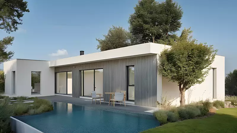 Ce modèle contemporain est complété par un garage attenant, très pratique pour le rangement et la protection du véhicule. Le chauffage par pompe à chaleur et la distribution d'eau chaude individuelle garantissent des économies d'énergie et un confort thermique constant.