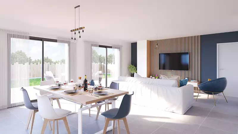 Une maison généreuse pour voir grand !. Pensée pour ceux qui aiment l’espace et l’équilibre, cette maison familiale offre une configuration remarquable. L’entrée s’ouvre sur une pièce de vie fluide et lumineuse, parfaite pour recevoir ou simplement profiter du quotidien. Le coin nuit accueille quatre chambres confortables, dont une suite parentale avec salle d’eau et dressing, bien séparée pour préserver l’intimité. Une salle de bain, un cellier malin, un grand garage… Chaque détail a été conçu pour conjuguer fonctionnalité et confort de vie. Un modèle à personnaliser, taillé pour accompagner tous vos projets de vie. Pour un confort optimal et conforme à la RE2025, cette maison dispose d’une PAC avec plancher chauffant et volets roulants électriques. À noter : Le prix indiqué exclut les revêtements de sol des chambres, la cuisine aménagée, la peinture, la décoration, les raccordements, les frais de notaire et l’assurance dommages-ouvrage. (Piscine non contractuelle, non comprise dans le prix).