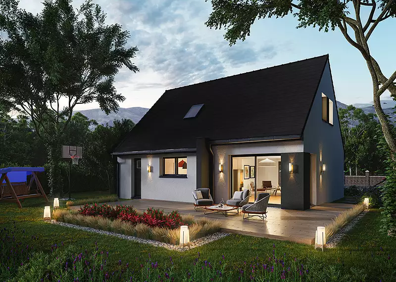 Cette maison moderne à étage d'une surface de 88.7m² avec garage vous laissera profiter d'un petit jardin.