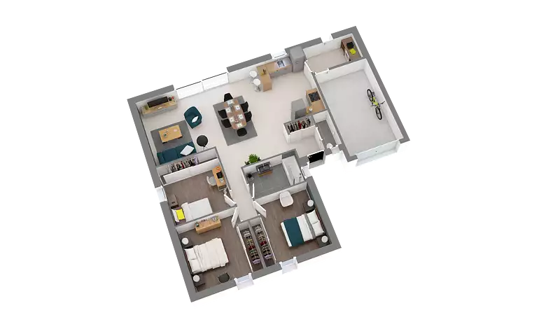 Spacieuse et fonctionnelle, cette maison de plain-pied vous propose un bel espace de vie lumineux de 46 m² environ , avec une grande baie vitrée donnant sur le jardin. Sa cuisine est ouverte sur le séjour et dispose d'un accès direct au cellier, et au garage intégré. Son espace nuit est composé de trois chambres avec rangements, d'une salle de bains et de wc séparés. Pour vous assurer un confort de vie et conformément à la RE2025, nous avons choisi un mode de chauffage par PAC + plancher chauffant, volets roulants électriques. Prix hors fourniture et pose : des appareils sanitaires (sauf système de chauffage et d'eau chaude sanitaire), du carrelage et de la faïence, des revêtements de sol dans les chambres. Hors décoration et aménagement intérieur et peinture. Hors raccordements, frais de notaire et dommage ouvrage.
