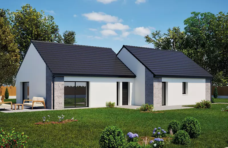 Cette maison de plain-pied à l'architecture moderne est construite sur vide sanitaire. Elle a été conçue par notre bureau d'études de manière à bien séparer l'espace de vie de l'espace de nuit. Le séjour cuisine, très lumineux grâce aux 2 baies vitrées, propose une grande superficie de plus de 55 m². D'une surface habitable totale de 111 m², cette maison dispose de 3 chambres dont l'une avec une salle d'eau privative, d'une salle de bains, d'un WC indépendant et d'un cellier de 6 m². Les menuiseries sont en PVC de couleur blanche. Plusieurs couleurs d'enduit extérieur sont proposées.