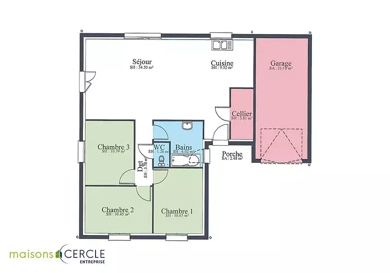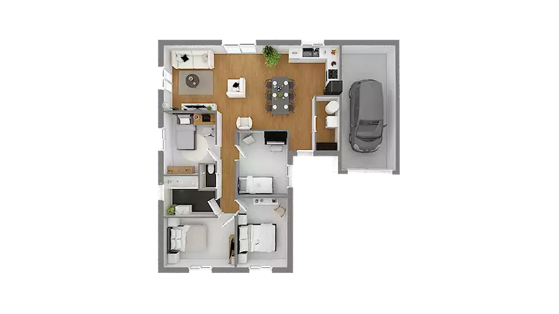 La Design L se compose de 4 pièces principales, dont 3 chambres confortables, un cellier pratique et un garage intégré, répondant ainsi aux besoins des familles en quête d'un foyer fonctionnel et accueillant. La disposition en ""L"" de la maison crée un espace extérieur protégé, idéal pour des moments de détente en toute intimité.