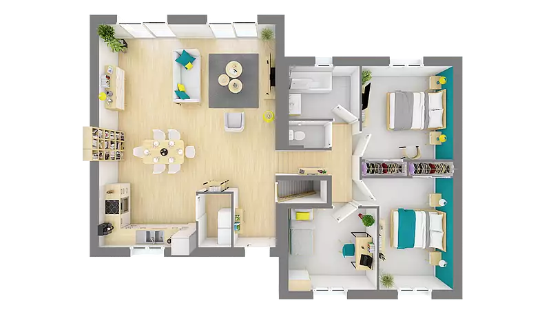 Cette maison de plain-pied dispose d'une surface de 86 m² et comprend 4 pièces, dont 3 chambres spacieuses. Vous avez la possibilité de choisir entre une toiture à 2 pans ou à 4 pans, selon vos préférences esthétiques et pratiques. De plus, vous pouvez opter pour un garage ou un sous-sol, en fonction de vos besoins spécifiques.