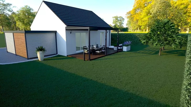 Exemple pour ce projet de maison avec ses 2 belles chambres, un séjour ouvert sur la cuisine le tout accompagné d'un garage qui peut être proposé en option et de prestations premiums haut de gamme pour un budget à partir de 189000 euros