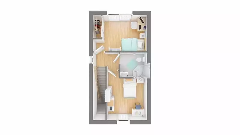 La maison dispose de 3 chambres et de 4 pièces, dont une suite parentale au rez-de-chaussée, permettant aux parents de vivre confortablement en bas pendant que les enfants se partagent l’étage. Une deuxième salle de bains est également présente pour plus de confort.