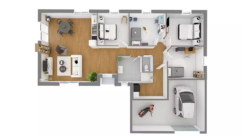 L'Efficium se distingue par son garage intégré, une solution pratique qui optimise l'espace de vie tout en offrant un accès direct à la maison, idéal pour les jours de pluie ou pour décharger facilement vos courses. La conception en L de la maison n'est pas seulement esthétique; elle permet également de créer un espace extérieur protégé, parfait pour vos moments de détente en famille ou entre amis.