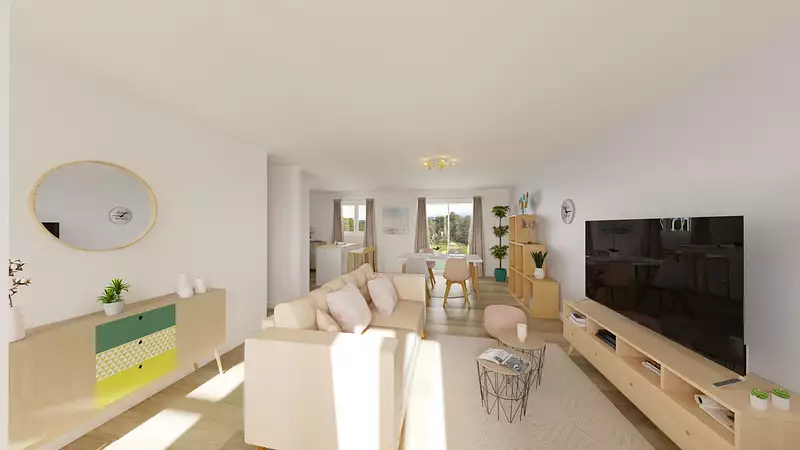 Grande pièce de vie lumineuse avec cuisine ouverte