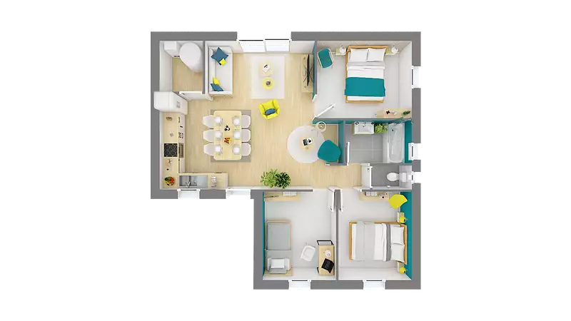 L'Émeraude se distingue par ses 3 chambres accueillantes et ses 4 pièces bien agencées, offrant un cadre de vie idéal pour une famille. Le plan en L de la maison permet une séparation intelligente entre l'espace jour et l'espace nuit, assurant ainsi intimité et tranquillité. Le séjour, spacieux et lumineux, est le cœur de la maison, un lieu de vie agréable où votre famille pourra se retrouver et partager des moments inoubliables.