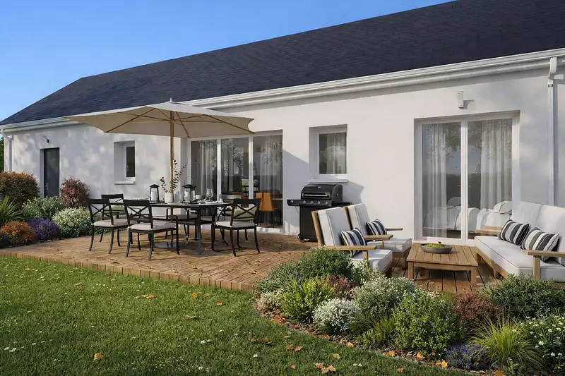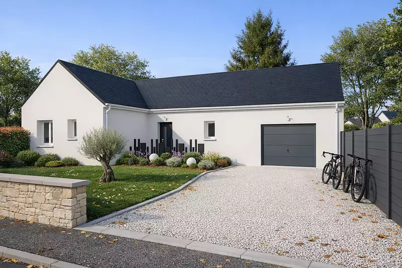 Maison en L, au design contemporain, proposant 2 chambres dont une avec dressing et une spacieuse pièce de vie lumineuse. Un agencement fonctionnel avec cellier et accès direct au garage, pensé pour faciliter le quotidien. Une maison confortable et pratique, idéale pour un cadre de vie serein et évolutive selon vos besoins avec possibilité d’aménager les combles. Pour un confort optimal et conforme à la RE2025, cette maison dispose d'une PAC avec plancher chauffant et volets roulants électriques. A noter : le prix indiqué exclut les revêtements de sol des chambres, la cuisine aménagée, la peinture, la décoration, le carport, les raccordements, les frais de notaire, l’adaptation au sol et l'assurance dommages ouvrage.
