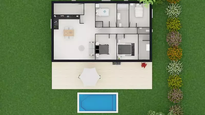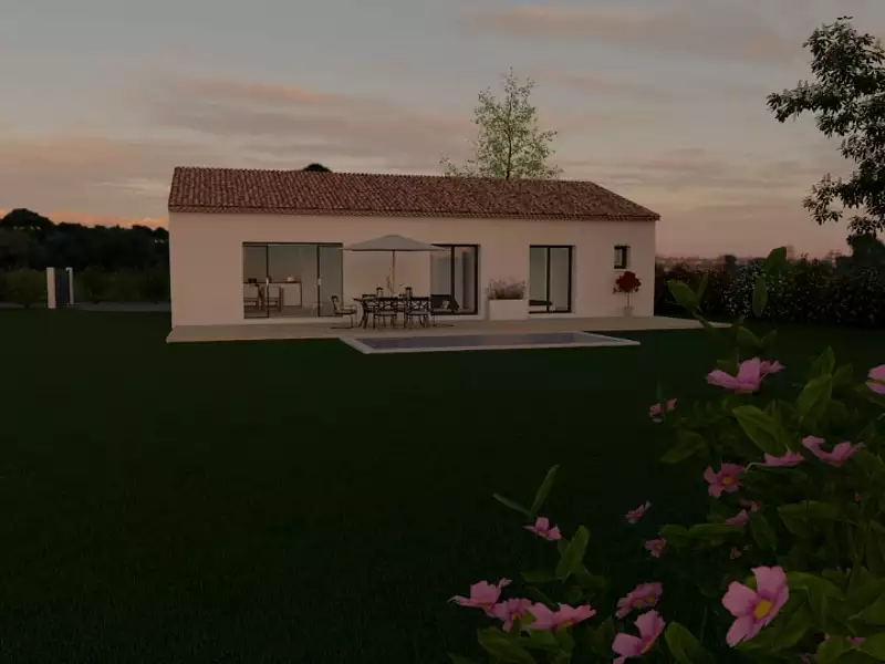 Le projet prévoit une maison neuve de 5 pièces avec une surface de 113 m² sur 1 100 m² de terrain. Conçue de plain-pied, elle dispose de quatre chambres, d'un espace cuisine ouvert sur le séjour et de deux salles d'eau.