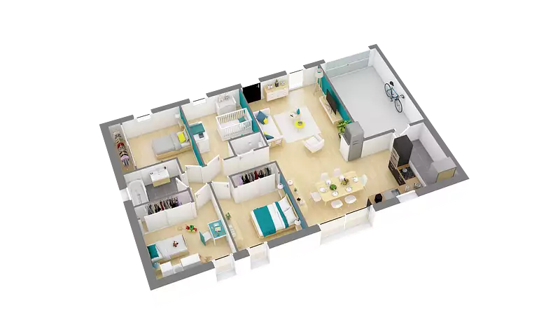 Familiale et lumineuse. Le modèle PANAY vous propose un plan de maison très astucieux. Cette maison est idéalement agencée avec une entrée sur un grand espace de vie et une cuisine ouverte accolée au cellier. La « zone jour » et délimitée de la « zone nuit » par un dégagement qui dessert quatre belles chambres, une salle de bain et les wc séparés. Pour le côté pratique, le garage est intégré à la maison. Pour vous assurer un confort de vie et conformément à la RE2025, nous avons choisi un mode de chauffage par PAC + plancher chauffant, volets roulants électriques. Prix hors fourniture et pose : des appareils sanitaires (sauf système de chauffage et d'eau chaude sanitaire), du carrelage et de la faïence, des revêtements de sol dans les chambres. Hors décoration et aménagement intérieur et peinture. Hors raccordements, frais de notaire et dommage ouvrage.