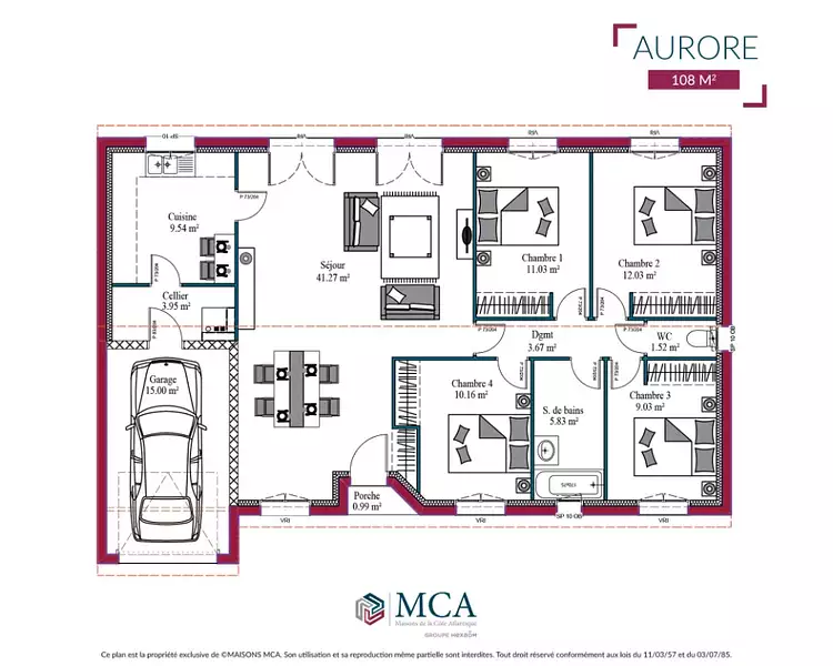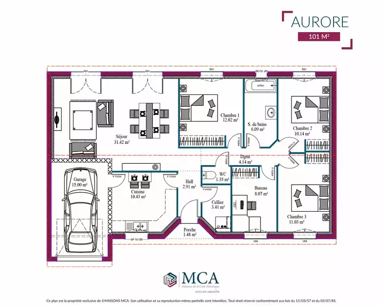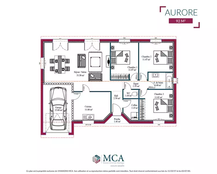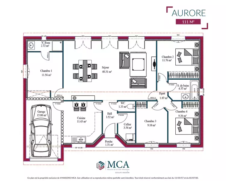 Une maison aux lignes sobres dont l'entrée est marquée par un agréable porche. D'une superficie de 111m2, ce modèle offre un hall d'entrée avec cellier et WC séparés, un beau séjour de plus de 40m2 tourné vers le jardin, et une grande cuisine fermée. L'espace nuit est quant à lui composé de 3 chambres avec placards, regroupés autour de la salle de bains. Elle dispose également d'une suite parentale à l'écart, avec sa propre salle d'eau.