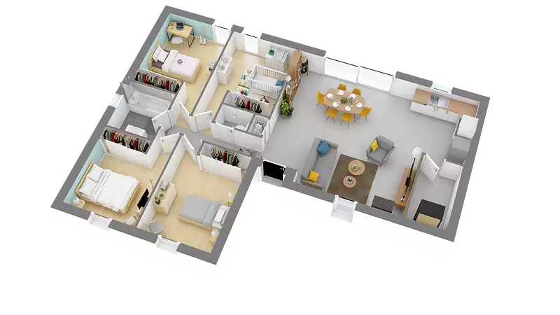 Traditionnelle et familiale, cette maison est idéalement agencée en deux volumes distincts, l'espace de vie et la zone de nuit. Son espace de vie traversant avec sa cuisine US bénéficie de deux orientations qui favorisent la luminosité. Son espace nuit est composé de 4 belles chambres avec rangements, d'une salle de bains, et des wc séparésPour vous assurer un confort de vie et conformèment à la RE2025, nous avons chosi un mode de chauffage par PAC + plancher chauffant, volets roulants électriques, Prix hors fourniture et pose : des appareils sanitaires (sauf système de chauffage et d'eau chaude sanitaire), du carrelage et de la faïence, des revêtements de sol dans les chambres. Hors décoration et aménagement intérieur et peinture. Hors raccordements, frais de notaire et dommage ouvrage.