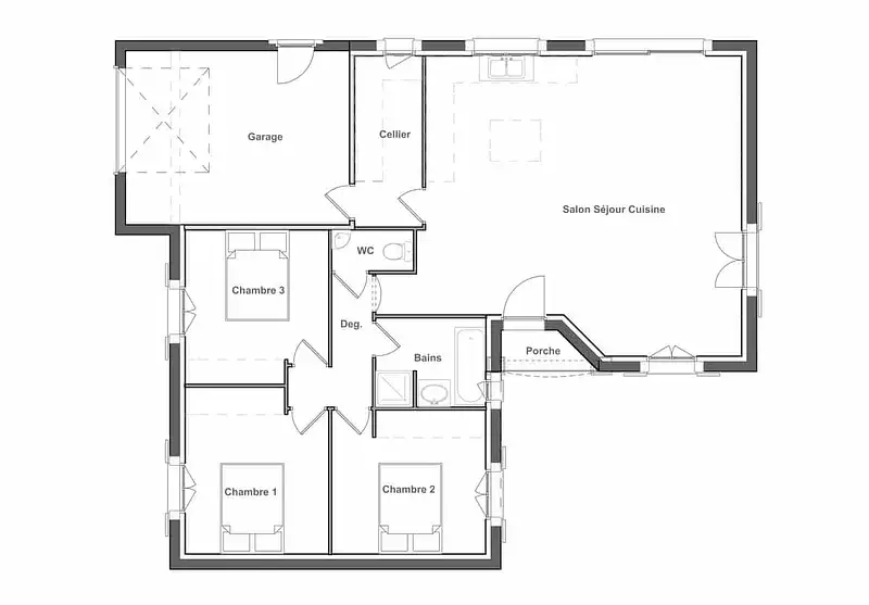 Cette maison de 92 m², conçue en plan en L, offre un cadre de vie idéal pour toute la famille. Avec ses trois chambres spacieuses et ses quatre pièces bien agencées, elle combine confort et fonctionnalité. Le modèle Eysines se distingue par son porche accueillant et son toit à deux pans ou quatre pans, selon vos préférences.