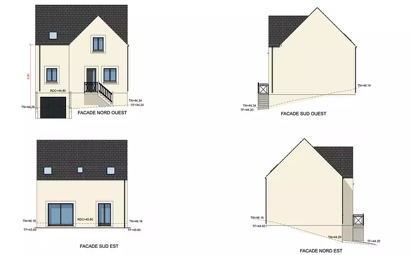 Model R+comble surélevé, 4 CHAMBRES A L'ÉTAGE ET UN BUREAU AU RDC.