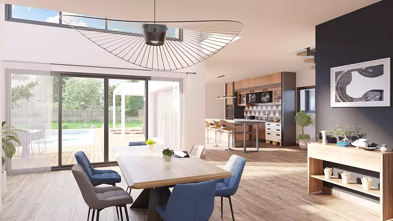 Cette maison contemporaine séduit par son architecture c ubique et toit plat, véritables emblèmes d'un style moderne et affirmé. Le rez-de-chaussée offre une vaste pièce de vie ouverte sur l'extérieur, une suite parentale avec dressing et salle de bains, un bureau, une salle de sport, ainsi qu'une buanderie, un cellier et un garage pour plus de praticité. A l'étage, trois chambres et une salle d'eau complètent cet agencement harmonieux. Ce projet, entièrement personnalisable, allie design, espace et bien-être familial pour s'adapter à votre mode de vie. Pour vous assurer un confort de vie et conformément à la RE2025, nous avons choisi un mode de chauffage par PAC + plancher chauffant, volets roulants électriques. Prix hors décoration, hors revêtement de sol dans les chambres, hors frais de notaire, raccordements, dommage ouvrage. (Piscine non contractuelle et non comprise dans le prix. ).