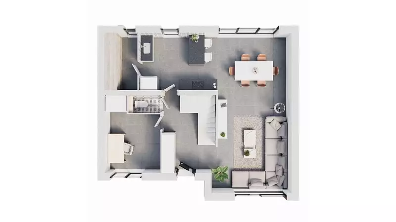 Cette maison Berval vous offre au rez-de-chaussée un espace salon/séjour, un bureau/chambre d'amis, une cuisine avec un cellier et une vaste entrée avec placard.