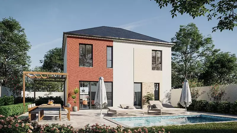 Ce modèle néo-rétro aux volumes généreux possède un double toit, un perron d'entrée, de grandes baies vitrées et un jeu d'enduits original.