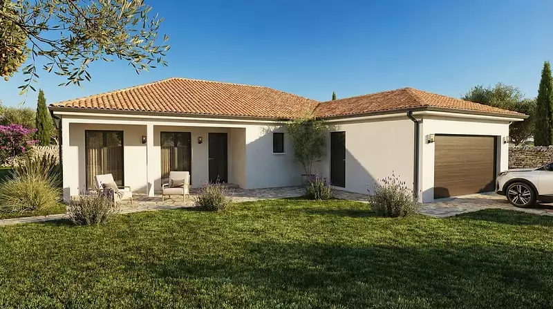 Sur ce terrain, nous vous proposons cette maison neuve : la Sauvetière sud. Avec ses allures de maison moderne et son plan en L, la Sauvetière sud vous séduira à coup sûr. Ce modèle de plain-pied économique dispose dans toutes ses versions d'un grand séjour lumineux, d'une galerie et d'un garage formant le L de la maison !
