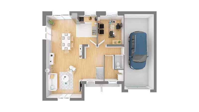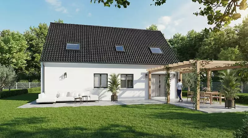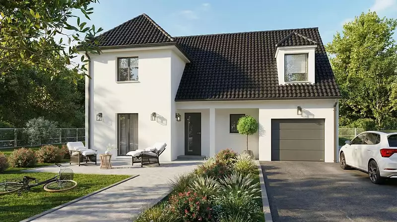 Cette maison familiale, avec son plan en L chic et résolument de luxe, est disponible en une version unique de 120 m². Elle est équipée d'une dalle étage en béton et d'une charpente traditionnelle, garantissant robustesse et durabilité.