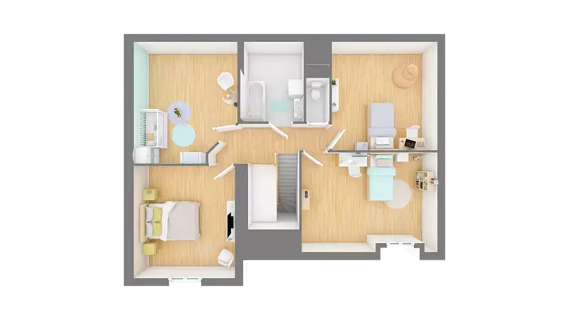 La Domainière à étage se distingue par une tour dans le prolongement du pignon, qui agrandit le séjour et crée un beau volume dans la chambre située à l'étage de la tour. La présence du garage sur le côté opposé permet d'aménager 4 chambres dans la surface totale des combles, offrant ainsi un espace de vie optimal pour toute la famille.