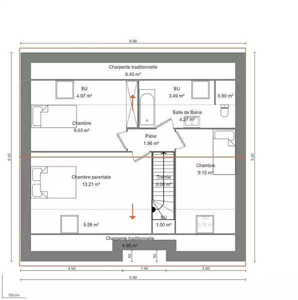 Il s'agit d'une maison de 4 pièces en combles, d'une surface de 110 m².