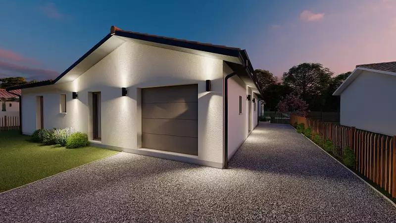 Le projet comprend une maison individuelle de plain-pied en L, développant environ 90 m² habitables. Elle se compose de trois chambres, d'un espace de vie lumineux avec salon et cuisine ouverte, pensé pour une circulation fluide et un confort quotidien. L'architecture en L permet une belle ouverture sur l'extérieur et une séparation naturelle des espaces jour et nuit.