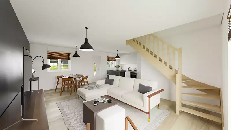 Cette maison basse consommation à étage de 75 m2 habitables , offre de belles prestations et se compose d’un grand espace de vie ouvert de 33m2 en séjour et cuisine .