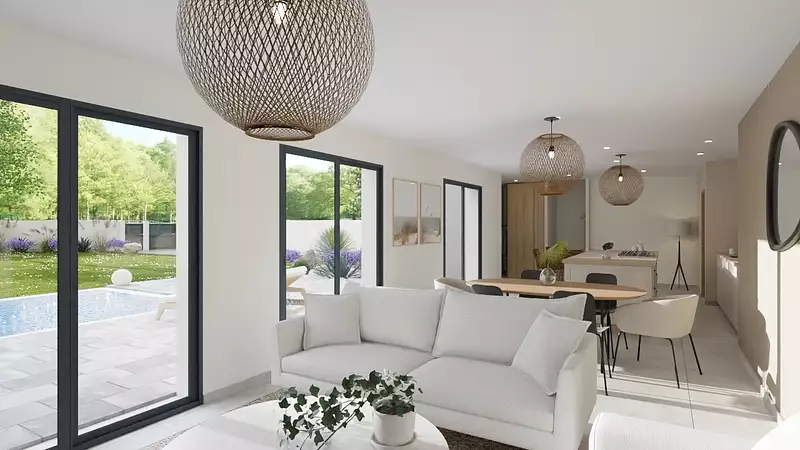 Une grande pièce à vivre baignée de lumière grâce aux larges ouvertures, ouverte sur la terrasse et le jardin, pour des moments de partage en famille.