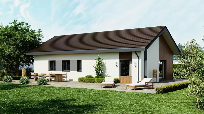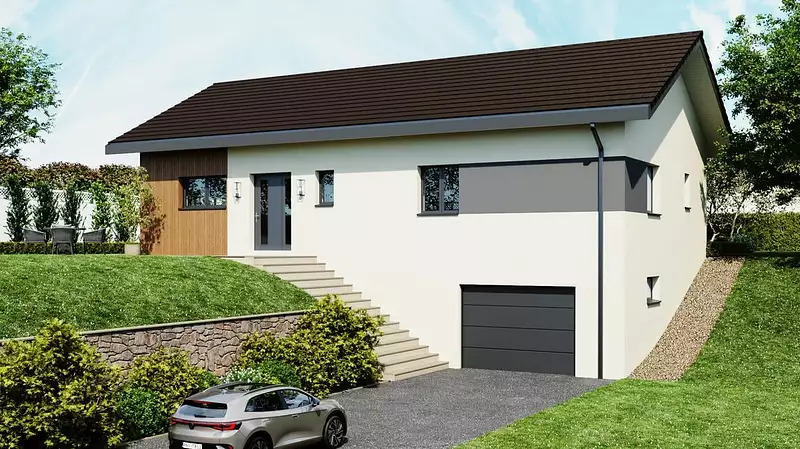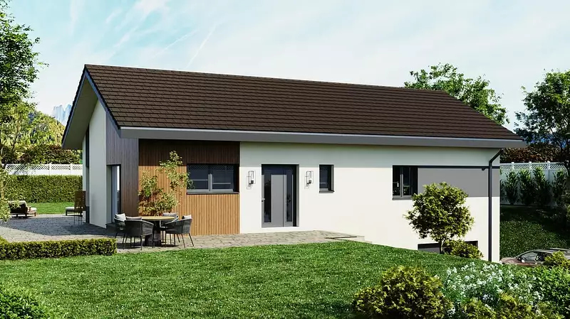 Maisons et Chalets des Alpes, le constructeur avec les meilleurs avis clients de la région, vous propose cette maison à petit prix, tout en vous offrant la possibilité de choisir parmi les options les plus demandées par nos clients : un garage accolé pour protéger votre véhicule, un plancher chauffant pour un confort optimal, un crépis coloré pour une touche d'originalité, des baies coulissantes pour une luminosité maximale, et une suite parentale pour un espace de détente privé.