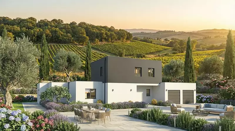 La Pauillac, une demeure contemporaine de grande classe, se distingue par son toit plat et son plan en L, offrant une géométrie complexe et élégante. Avec son enduit coloré, elle allie originalité et raffinement. Cette maison dispose également d'un double garage, un atout indéniable pour votre confort quotidien.