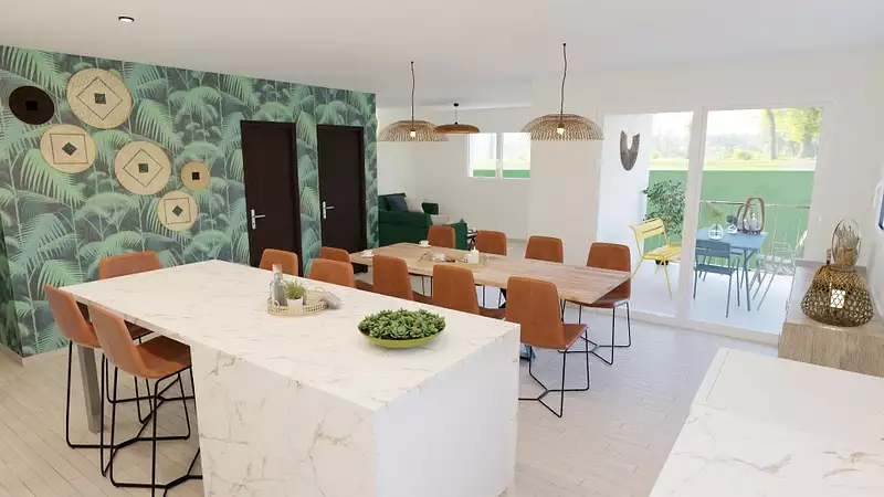 Une vaste pièce de vie de plus de 50 m², ouverte sur un balcon de 15 m² offrant une belle vue dégagée